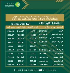 أسعار العملات الأجنبية اليوم 1 أكتوبر مقابل الجنيه السوداني اقتصاد بواسطة منصة السودان في أكتوبر 1, 2024 774 0 متابعة – منصة السودان – المزيد من المشاركات الجنيه السوداني يرتفع بشكل مفاجئ مقابل الدولار… مارس 1, 2026 بنك سوداني يقدم دعم نقدي مباشر للنازحين مارس 1, 2026 تشهد أسعار العملات الأجنبية استقرار نسبي في البنوك السودانية مقابل الجنيه ، حيث استقر سعر الدولار عند 1996 بينما بقية العملات كما هو موضح في الجدول ادناه اسعار العملات اضغط هنا للانضمام الى مجموعاتنا في واتساب أسعار العملات والدولاربنك الخرطوم