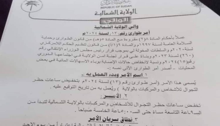 والي الشمالية يصدر أمر طوارئ بتخفيض ساعات حظر التجوال أخبار الولايات بواسطة منصة السودان في أكتوبر 13, 2024 351 0 متابعة – منصة السودان – المزيد من المشاركات البرهان يفاجئ أهالي الحاج يوسف قبل لحظات من… مارس 1, 2026 كسلا تحسم قضية التصرف في الأراضي الزراعية بالولاية مارس 1, 2026 أصدر والي الولاية الشمالية الاستاذ عابدين عوض الله أمر طوارئ بتخفيض ساعات حظر التجوال للأشخاص والمركبات بالولاية. ونص أمر الطوارئ على تخفيض ساعات الحظر لتبدا من الساعة التاسعة مساء وحتى الساعة الخامسة صباحا. اضغط هنا للانضمام الى مجموعاتنا في واتساب أمر طوارئالساعة التاسعةبتخفيض ساعات الحظروالي الولاية الشمالية