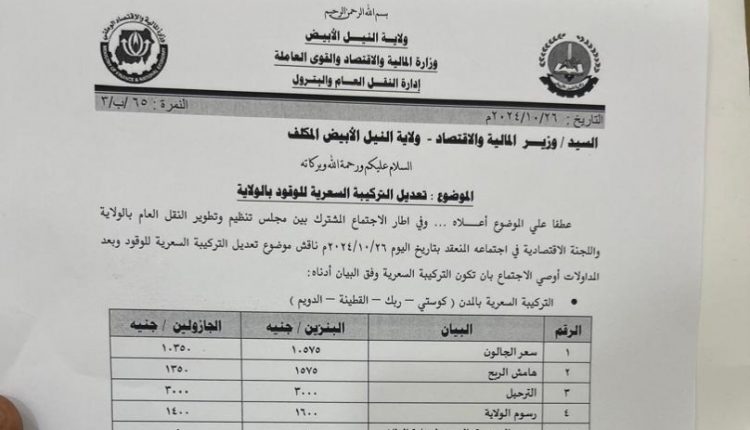 أصدر عبدالباسط جعفر إبراهيم المدير العام للإدارة العامة للنقل العام والبترول بولاية النيل الأبيض، قرارًا قضى بتعديل التركيبة السعرية للوقود بالولاية بمدن كوستي وربك والدويم والقطينة.