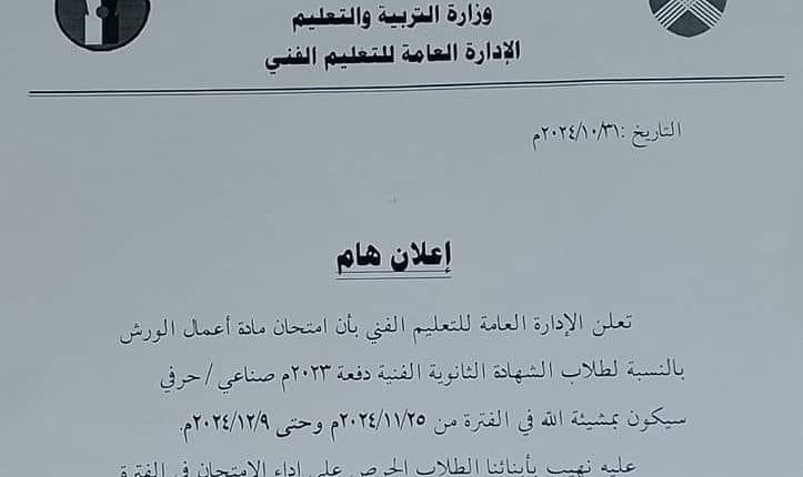 تعلن الإدارة العامة للتعليم الفني بأن امتحان مادة اعمال الورش بالنسبة لطلاب الشهادة الثانوية (صناعي / حرفي) دفعة ٢٠٢٣ ستعقد في الفترة من ٢٥ نوفمبر وحتى ٩ ديسمبر ٢٠٢٤ م .