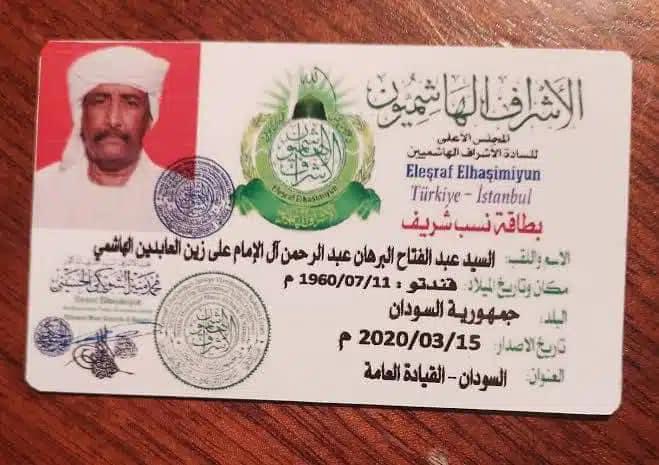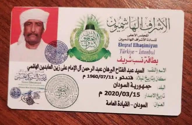 وجاء ببطاقة النسب المفبركة المنسوبة للسادة الأشراف الهاشميين صورة غريبة للبرهان مرفق بها اسمه كاملا ومحل ميلاده ومحل الإقامة.
