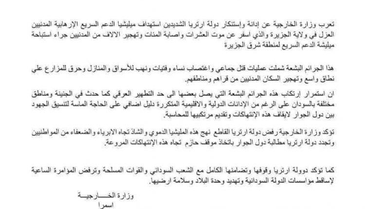 أعربت دولة إريتريا، عن إدانتها واستنكارها الشديدين استهداف ميليشيا الدعم السريع الإرهابية المدنيين العزل في ولاية الجزيرة والذي اسفر عن موت العشرات واصابة المئات وتهجير الآلاف من المدنيين جراء استباحة مليشيا الدعم السريع المنطقة شرق الجزيرة.
