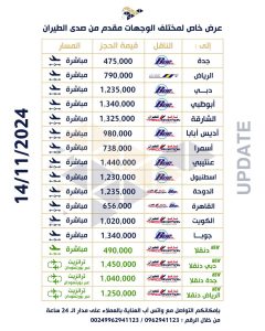 أصدرت منصة صدى الطيران تحديث لأسعار تذاكر الطيران وحجوزات الطيران بتاريخ 14 نوفمبر 2024م لمختلف الوجهات الدولية، وقالت إن قسم الحجوزات و إصدار التأشيرات متاح على مدار الـ 24 ساعة، ونوهت إلى ان طُرق الدفع المتاحة : بنكك أو ريال سعودي أو درهم إماراتي أو جنيه مصري.