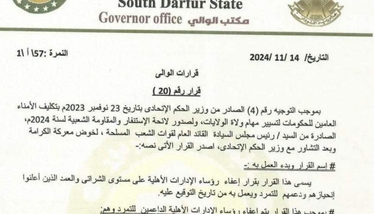 ويأتي القرار امتدادًا لقرارات أصدرها الوالي في التاسع من نوفمبر الجاري، قضت بإعفاء 7 من نظّار القبائل العربية وقبيلة الفلاتة الموالين لقوات الدعم السريع بولاية جنوب دارفور.