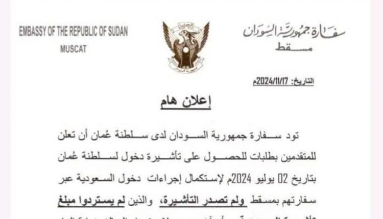 تود سفارة جمهورية السودان لدى سلطنة عمان أن تعلن للمتقدمين بطلبات للحصول على تأشيرة دخول لسلطنة عمان بتاريخ 2 يوليو 2024 لاستكمال إجراءات دخول السعودية عبر سفارتهم بمسقط ( ولم تصدر التأشيرة) والذين ( لم يستردوا مبلغ تأشيرة السعودية) بأن اخر موعد لاسترداد المبالغ بنهاية العام الحالي 31 ديسمبر 2024