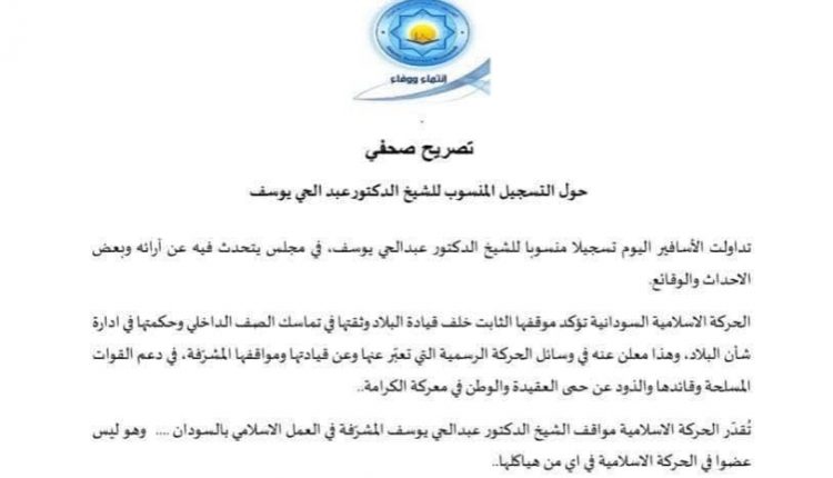 أكدت الحركة الاسلامية السودانية في بيان عدم وجود اي علاقة للشيخ عبدالحي يوسف بتنظيم الحركة ، وجددت الحركة دعمها و مساندتها للقوات المسلحة السودانية بحسب البيان الذي صدر مساء اليوم الجمعة ، وذلك في أعقاب انتقادات واسعة شنها الداعية عبدالحي يوسف على قادة الجيش و رئيس مجلس السيادة