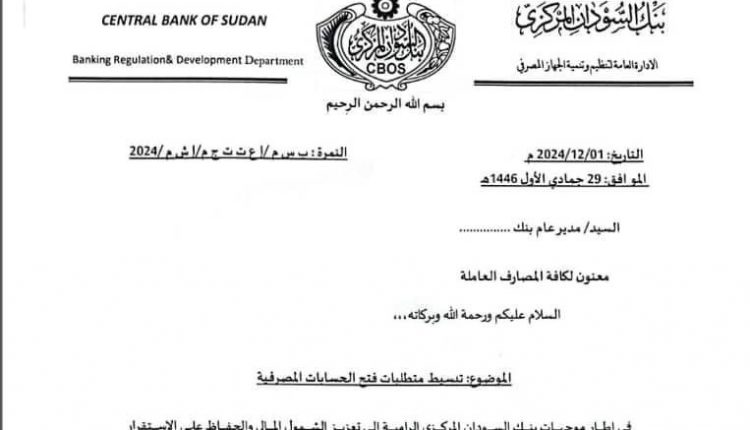 وجه بنك السودان المركزي جميع المصارف العاملة بالبلاد بتبسيط إجراءات فتح الحسابات المصرفية .