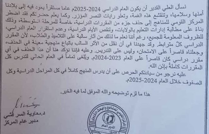 المركز القومي للمناهج ينفي وجود حذف بالمقررات للعام الدراسي 2024 – 2025م ويطالب بتدريس المنهج كاملا في كل المراحل الدراسية وكل الصفوف حيث أوضح ان التفاصيل التي حذفت للعام 2023 – 2024م نسبةً لما تمر به الظروف البلاد والطلاب وابلغ المركز القومي للمناهج والبحث التربوي على حرص والتزام جميع المدارس تدريس المناهج كاملة في كل المراحل الدراسية.