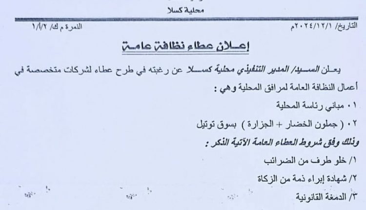 اعلان طرح عطاء لشرکات متخصصة فی النظافة العامة – محلیة كسلا