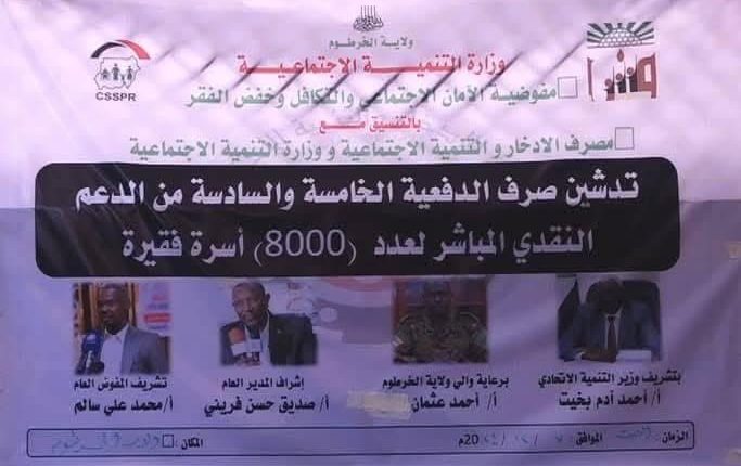 وقال الوزير آدم بخيت أن ولاية الخرطوم كعاصمة للبلاد يجب أن تجد الأولوية في الدعم واضاف ان برنامج الدعم النقدي المباشر يستهدف ٧٠ الف أسرة وان هناك مقترحات لزيادة التغطية الى (٦٠٠)ألف أسرة في العام القادم وقال ان هذه الاسر ستتلقى الدعم المتآزر والذي يشمل التغطية بخدمات التأمين الصحي وتمليك وسائل انتاج وصرف المعاشات وكشف الوزير ان الوزارة بدأت في تنفيذ برنامج شراكات قوية تضم الوزارات الاتحادية والزكاة ووكالات الامم المتحدة ومنظمات المجتمع المدني والقطاع الخاص لتعمل بشكل متآزر لمكافحة الفقر وبدأ البرنامج بولاية القضارف وسينتقل لبقية الولايات.