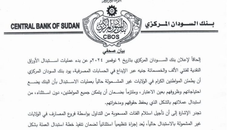 إلحاقاً لإعلان بنك السودان المركزي بتاريخ ٩ نوفمبر ٢٠٢٤م عن بدء عمليات استبدال الأوراق النقدية لفئتي الألف والخمسمائة جنيه عبر الإيداع في الحسابات المصرفية، يود بنك السودان المركزي أن يطمئن المواطنين الكرام في الولايات غير المشمولة حالياً بعمليات الاستبدال بأن البنك يضع احتياجاتهم وظروفهم بعين الاعتبار، وملتزماً بضمان أن يتمكن جميع المواطنين، دون استثناء، من استبدال عملاتهم بالشكل الذي يحفظ حقوقهم ومدخراتهم.