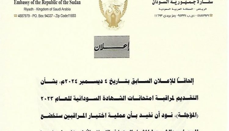 اوضحت سفارة السودان بالمملكة العربية السعودية، ان عملية اختيار المعلمين لمراقبة امتحانات الشهادة السودانية المؤجلة ستكون عبر لجنة برئاسة ممثل وزارة التربية والتعليم في الرياض والذي سينتدب الي الرياض للاشراف على عملية الامتحانات بما فيها اختيار المعلمين