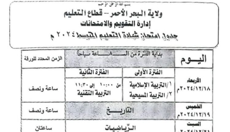 تحديد موعد إمتحانات الشهادة المتوسطة بالبحر الأحمر أخبار الولايات بواسطة منصة السودان في ديسمبر 13, 2024 546 0 متابعة- منصة السودان – المزيد من المشاركات القائد العام يصدر قرارات شُجاعة فبراير 3, 2026 “رسوم نقل الجثامين” تثير سخط… فبراير 3, 2026 قالت وزارة التربية والتعليم بولاية البحر الاحمر ان يوم الاربعاء ٢٠٢٤/١٢/١٨ سيشهد بداية انطلاق امتحانات الشهادة المتوسطة. اضغط هنا للانضمام الى مجموعاتنا في واتساب البحر الاحمرامتحانات الشهادة المتوسطةانطلاقوزارة التربية والتعليم