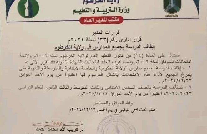 قرار بإيقاف الدراسة بجميع المراحل في ولاية الخرطوم أخبار الولايات بواسطة منصة السودان في ديسمبر 15, 2024 6٬836 0 متابعة – منصة السودان – المزيد من المشاركات كسلا تحسم قضية التصرف في الأراضي الزراعية بالولاية مارس 1, 2026 قرار مفاجئ بتعليق العمل القضائي في محاكم بولاية… مارس 1, 2026 قررت وزارة التربية والتعليم بولاية الخرطوم إيقاف الدراسة بجميع مدارس الولاية الحكومية والخاصة الابتدائية والمتوسطة والثانوية اعتبارا من الأحد ٢٠٢٤/١٢/٢٢ وحتى ٢٠٢٥/١/١٢ وذلك استعدادا لامتحانات الشهادة السودانية المؤجلة. اضغط هنا للانضمام الى مجموعاتنا في واتساب إيقاف الدراسةالخرطومالشهادة السودانيةمدارسوزارة التربية والتعليم