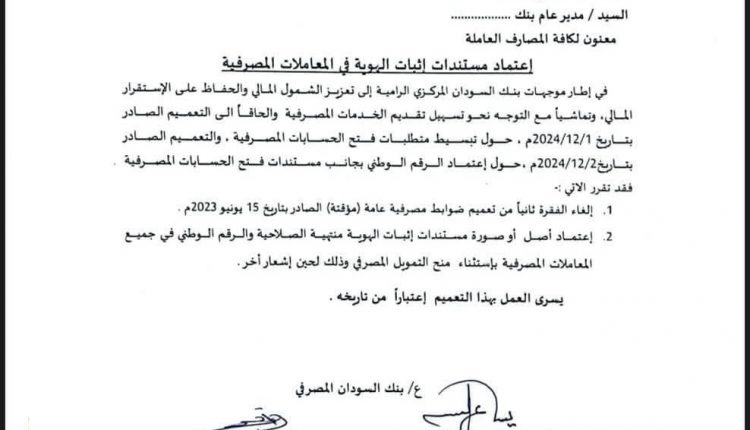 في إطار تسهيل تقديم الخدمات المصرفية أصدر بنك السودان المركزي اليوم تعميماً للمصارف العاملة نص على اعتماد أصل أو صورة مستندات إثبات الهوية منتهية الصلاحية والرقم الوطني في جميع المعاملات المصرفية باستثناء منح التمويل المصرفي، وذلك إلى حين إشعار آخر.