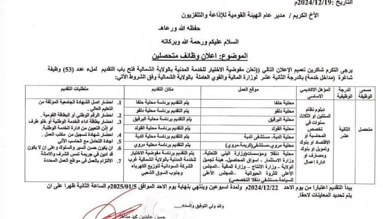 مفوضية الإختيار للخدمة العامة بالشمالية تعلن عن فتح باب التقديم وظائف متحصلين (53 وظيفة) شاغرة (مداخل خدمة) بالدرجة الـ 12 بوزارة المالية والقوى العاملة وذلك للعمل بمحليات (وادي حلفا ، دلقو ، البرقيق ، دنقلا ، القولد ، الدبة ومروي) وفقاً للشروط أدناه :