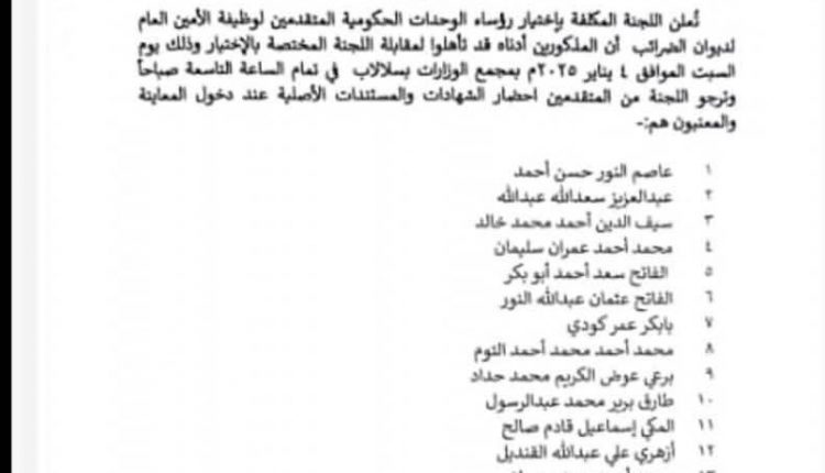 أعلنت اللجنة المكلفة باختيار رؤساء الوحدات الحكومية المتقدمين لوظيفة الأمين العام لديوان الضرائب أن المذكورين أدناه قد تأهلوا لمقابلة اللجنة المختصة بالإختيار وذلك يوم السبت الموافق 6 يناير ۲۰۲٥، بمجمع الوزارات بسلالاب في تمام الساعة التاسعة صباحاً وترجو اللجنة من المتقدمين احضار الشهادات والمستندات الأصلية عند دخول المعاينة والمعنيون هم: