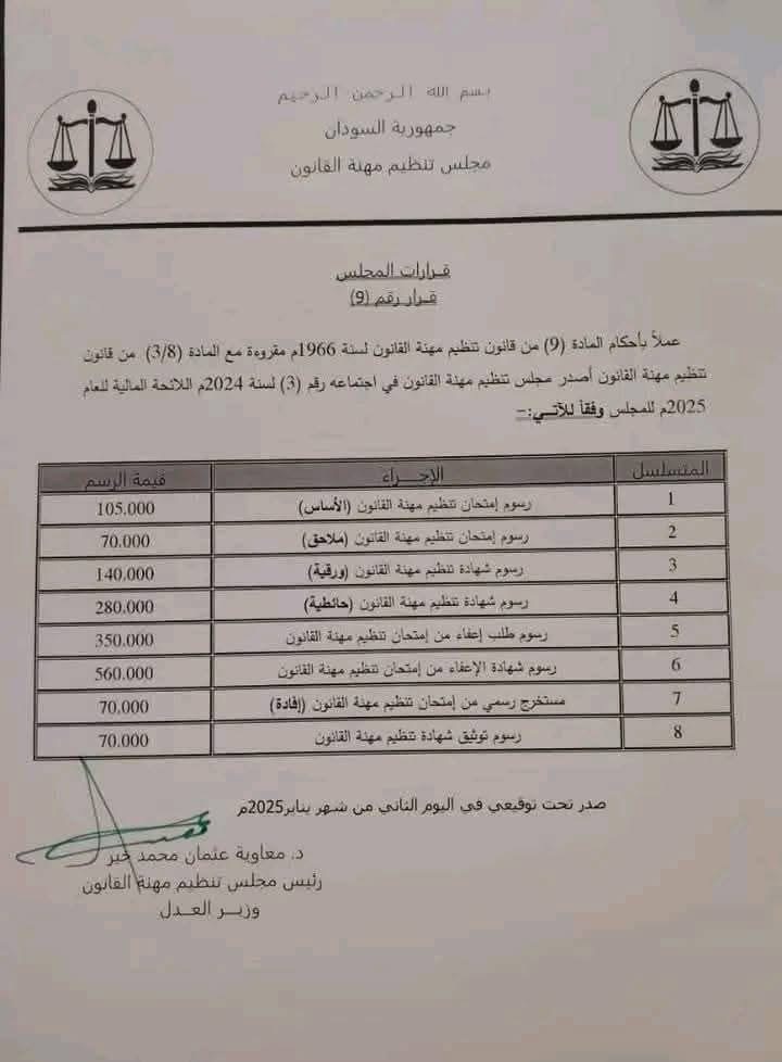 اعلن مجلس تنظيم مهنة القانون في السودان عن زيادات جديدة لعدد من الإجراءات التي يقدمها لمنسوبيه وشملت الزيادات الشهادات الحائطية وطلب الإعفاء من الامتحان بالإضافة لرسوم التوثيق وجاءت اللائحة المالية كالآتي: