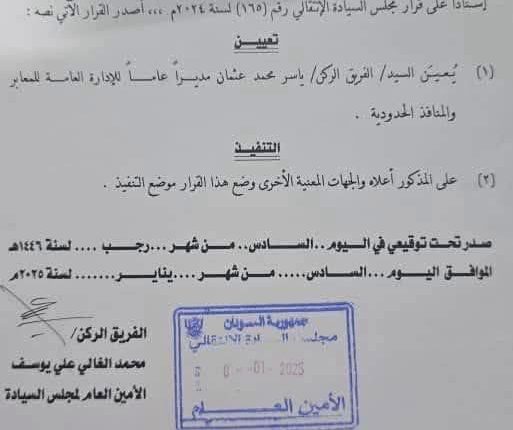 قرار جديد من مجلس السيادة أخبار محلية بواسطة منصة السودان في يناير 16, 2025 1٬593 0 متابعة- منصة السودان- المزيد من المشاركات بيان عاجل من القوات المسلحة السودانية فبراير 3, 2026 والي غرب كردفان يطيح بعدد من المسؤولين في حكومته فبراير 3, 2026 أصدر الأمين العام لمجلس السيادة الفريق ركن محمد الغالي قرار قضي بموجبه تعيين الفريق ركن ياسر محمد عثمان مديرا عاما للإدارة العامة للمعابر والمنافذ الحدودية وعلى الجهات ذات الصلة وضع القرار موضع التنفيذ. اضغط هنا للانضمام الى مجموعاتنا في واتساب الأمين العام لمجلس السيادةالمنافذ الحدوديةتعيينقرار