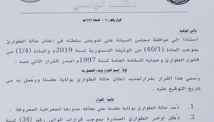 اصدر والي كسلا المكلف اللواء ركن معاش الصادق محمد الازرق القرار رقم(5) لسنة 2025 والذي قضي بتمديد حالة الطوارئ بولاية كسلا بكافة حدودها الجغرافية المعروفة.
