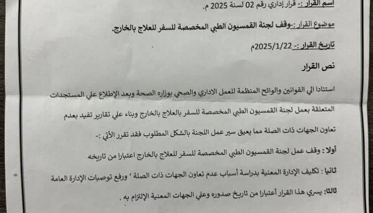 قررت لجنة القمسيون الطبي المخصصة للسفر للعلاج بالخارج بمستشفى وادي حلفا، إيقاف عملها اعتبارا من اليوم الأربعاء.