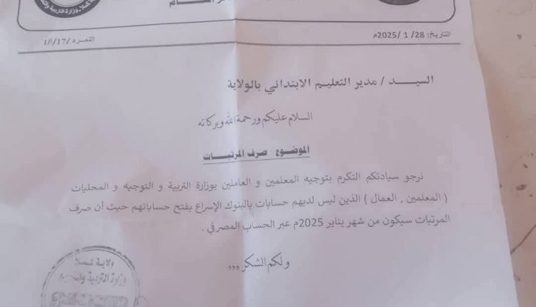 صرف مرتب شهر يناير لكل الموظفين والعاملين بالدولة في جميع الولايات سيكون عبر الحساب المصرفي فقط