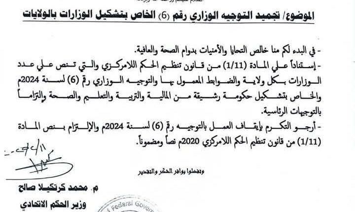 أصدر وزير الحكم الإتحادي محمد كرتكيلا صالح قرار استناداً على المادة (١/١١) من تنظيم قانون الحكم اللامركزي والتي تنص على عدد الوزارات بكل ولاية والخاصة بتشكيل حكومة رشيقه من المالية والتربية والتعليم والصحة والتزاما بالتوجيهات الرئاسية