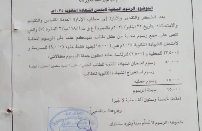 وجّه الأستاذ أحمد حامد أحمد يس، المدير العام لوزارة التّربية والتّعليم بولاية نهر النّيل، الوزير المُكَلَّف إدارات التّعليم الثّانوي بالمحليّات، وإدارات المدارس الثّانويّة،بعدم فرض أي رسوم إضافيّة على رسوم امتحانات الشّهادة الثّانويّة للعام (2024) والبالغ قدرها (65) ألف جنيها سودانيا وذلك حسب التّفاصيل الموضّحة في الخطاب المرفق،فهي غير متضمنة رسوم استخراج الشّهادة الثّانويّة باعتبار أن استخراج الشّهادة مسؤوليّة فرديّة.