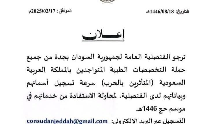 ترجو القنصلية العامة لجمهورية السودان بجدة من جميع حملة التخصصات الطبية المتواجدين بالمملكة العربية السعودية ( المتأثرين بالحرب ) سرعة تسجيل أسمائهم وبياناتهم لدى القنصلية لمحاولة الاستفادة من خدماتهم في موسم حج 1446 هـ .