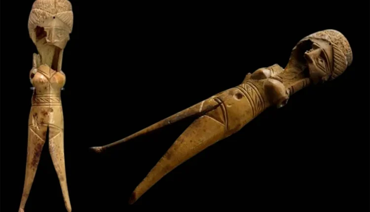 يبلغ طول هذا التمثال 17.5 سنتيمتراً، ويظهر عند طرف كل من كتفيه ثقب دائري، ويوحي هذان الثقبان بأن هذا المجسّم المصنوع من العظم كانت له أطرافٌ مفصليّةٌ مستقلّة صُنعت من مواد قابلةٍ للتلف، والأرجح أنها كانت من الخشب. يُعرف هذا الطراز من التماثيل الأنثوية المنمنمة بالدمى المتحرّكة، ويتميّز بذراعين تمّ ربطهما بالصدر بواسطة خيوط، ممّا يسمح بتحريكهما. يعود أقدم شواهده الأصلية إلى الألفية الثالثة قبل الميلاد، مصدرها مصر، وتشكّل هذه الشواهد أساساً للتقليد المتّبع حتى يومنا هذا في صناعة اللعب. وصل هذا التقليد كما يبدو إلى البحرين منذ تلك الفترة الموغلة في القدم، كما تشهد قطعة عاجية استثنائية من محفوظات المتحف البريطاني في لندن، تعود إلى الألفية الثانية قبل الميلاد. وصل هذا التمثال بشكل مجتزَأ، ويبلغ طوله 21 سنتيمتراً، ومصدره المقبرة الشهيرة بـ«تلال مدافن دلمون»، وهي حقل تلال مدافن عالي الشرقي، نسبةً إلى مدينة عالي في المحافظة الشمالية، وتقع في وسط البحرين، إلى جنوب مدينة عيسى، وإلى شمال مدينة الرفاع.