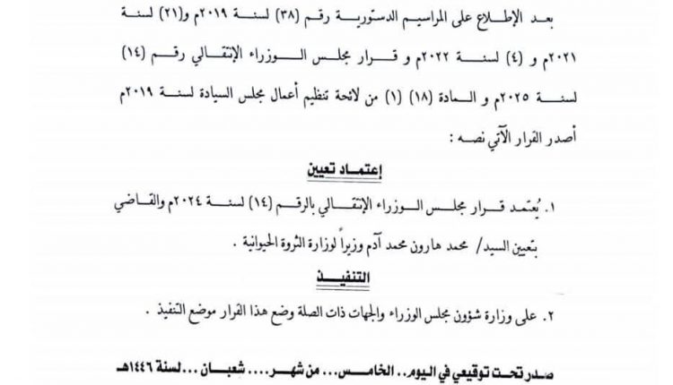 اصدر رئيس مجلس السيادة الانتقالي الفريق اول ركن عبدالفتاح البرهان قرار رقم 25 لعام 2025 قضى بتعيين محمد هارون محمد ادم وزيرا للثورة الحيوانية