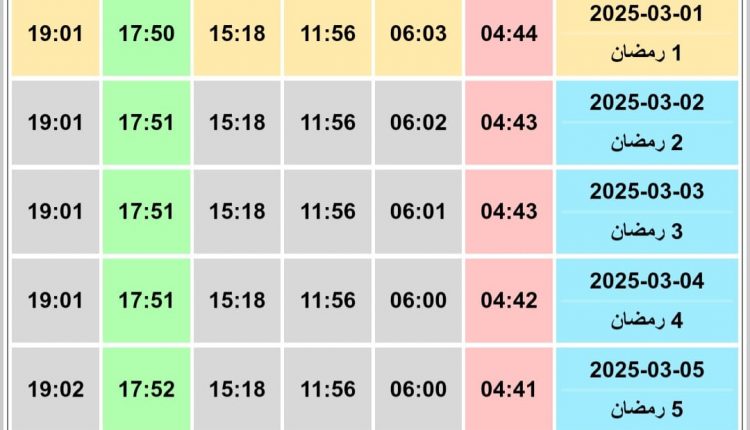 بينما يوضح الجدول ادناه تفاصيل امساكية رمضان في بورتسودان بشرق البلاد