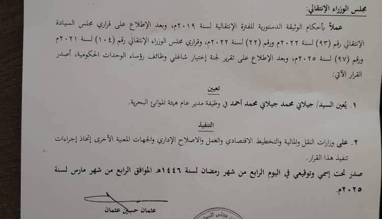 أصدر مجلس الوزراء قراراً اليوم بناءً على توصية لجنة اختيار شاغلي وظائف رؤساء الوحدات الحكومية، بتعيين السيد/ م. جيلاني محمد جيلاني محمد أحمد في وظيفة مدير عام هيئة الموانئ البحرية.