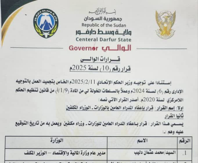 اصدر والي ولاية وسط دارفور  مصطفى تمبور  قراراً بإعفاء عدد من  الوزراء، وتحصلت منصة السودان الاخبارية على صورة من القرار حيث تم اعفاء السيد محمد عثمان مدير عم وزارة المالية الوزير المكلف ، والسيد عبداللطيف ابراهيم مدير عام وزارة التربية والتعليم الوزير المكلف ، كما تم اعفاء السيد د. مدثر ادم هرون مدير عام وزارة الصحة ، ووجه القرار وزارة المالية والجهات ذات الصلة تنفيذ القرار من تاريخ صدوره اليوم