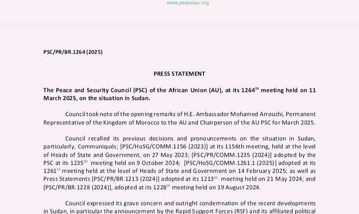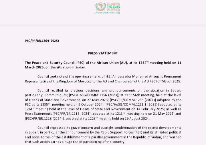 مجلس السلم والأمن الأفريقي وببيان قوي وبإجماع الدول الأعضاء بالمجلس وعددهم (15) دولة يدين إتجاهات إعلان حكومة موازية ويعلن رفضه لتقسيم السودان ، النقطة الجوهرية في البيان حصوله على إجماع دول المجلس الأفريقي