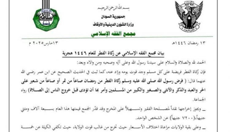 قدر مجمع الفقه الإسلامي قيمة زكاة الفطر لهذا العام ب7200جنيهاً للفرد، و على أهل كل ولاية اعتماد سعر ولقيتهم حيث( الكيلة ) تكفي عن خمسة أشخاص.