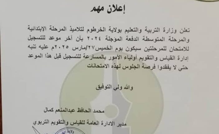 اعلن الاستاذ/ محمد الحافظ عبد المنعم كمال مدير الادارة العامة للقياس والتقويم التربوي بوزارة التربية والتعليم ولاية الخرطوم اولياء الامور والتلاميذ بالمرحلتين الابتدائية والمتوسطة الدفعة المؤجلة ۲۰۲٤م بأن آخر موعد للتسجيل للامتحان للمرحلتين سيكون يوم الخميس ٢٧ / مارس ٢٠٢٥م.