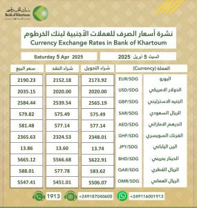 أسعار العملات الأجنبية مقابل الجنيه السوداني السبت اقتصاد بواسطة منصة السودان في أبريل 5, 2025 622 0 العملات الأجنبية متابعة – منصة السودان – شهدت اسعار العملات الاجنبية في السودان اليوم السبت 5 ابريل 2025م، استقرار نسبي في البنوك التجارية وبلغ سعر الدولار وفق لبنك الخرطوم 2035 المزيد من المشاركات الجنيه السوداني يرتفع بشكل مفاجئ مقابل الدولار… مارس 1, 2026 بنك سوداني يقدم دعم نقدي مباشر للنازحين مارس 1, 2026 الجدول ادناه يوضح تفاصيل الاسعار: اضغط هنا للانضمام الى مجموعاتنا في واتساب أسعارالأجنبيةالجنيه السودانيالعملات