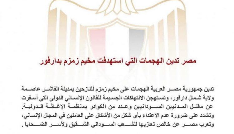 أعربت جمهورية مصر العربية عن إدانته للهجمات التي استهدفت مخيم زمزم بدارفور بمدينة الفاشر عاصمة ولاية شمال دارفور، وتستهجن الانتهاكات الجسيمة للقانون الإنساني الدولى التي أسفرت عن مقتل المدنيين السودانيين وعدد من الكوادر بمنظمة الإغاثة الدولية.
