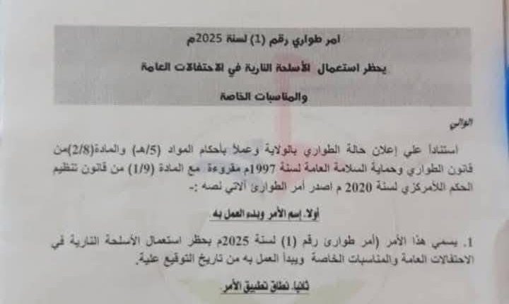 كما حظر الأمر على أفراد القوات النظامية والقوات المساندة الأخرى استخدام الأسلحة النارية في الأماكن العامة والخاصة إلا للأغراض الأمنية في حالة تأدية الواجب الوظيفي وفقًأ للقانون واللوائح، وألزم القرار، كل من يرغب في إقامة حفل أو احتفال خاص الحصول على تصديق مسبق من شرطة الولاية.
