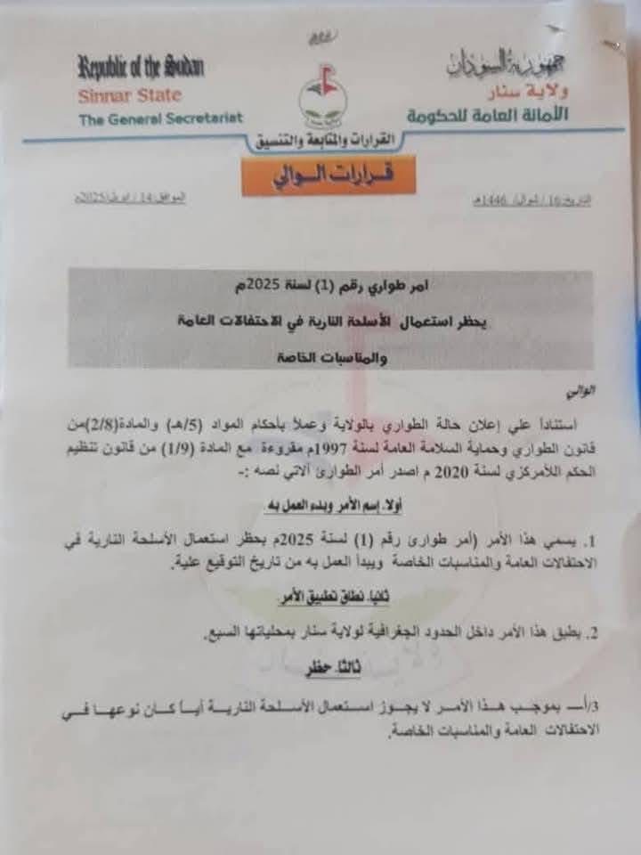 أصدر والي سنار، اليوم الخميس، أمر طوارئ، حظر بموجبه استعمال الأسلحة النارية في الاحتفالات العامة والمناسبات الخاصة.